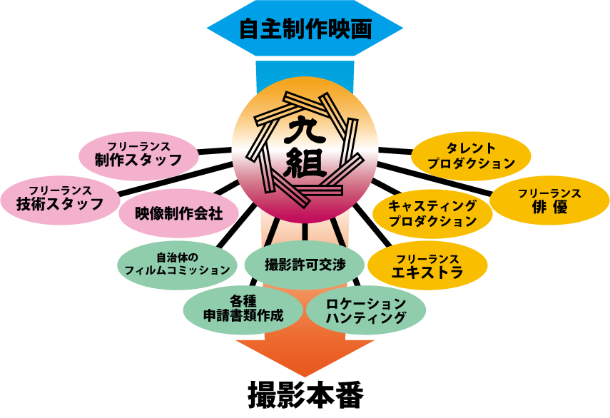 自主制作映画プロジェクト 九組では、地元である強みを活かし、東海エリアでの自主制作映画作品のコーディネート業務をサポートさせていただきます。